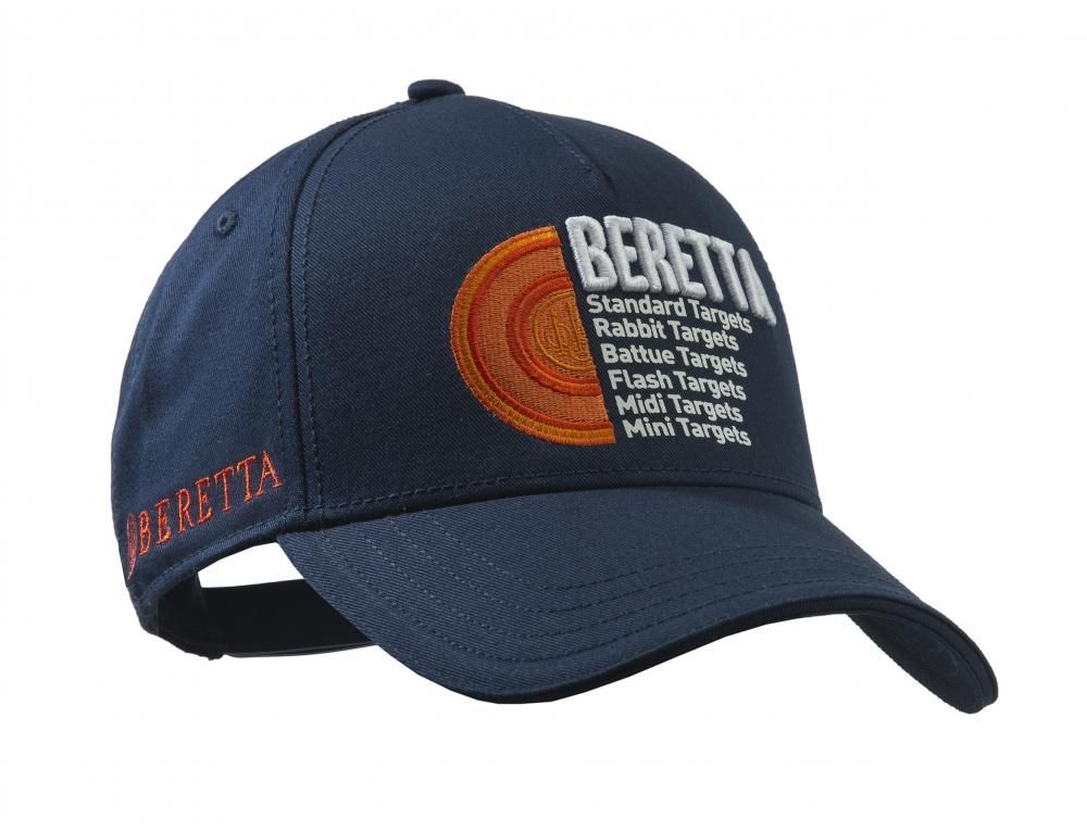 ベレッタ ディスクグラフィックキャップです。しっかりとしたコットン生地でつばはかなり厚手です。メッシュではありませんので冬〜春秋に向いております。このキャップはデザイン性に優れており、フロント部はユニークな形状のクレーとベレッタスリーアローマークがオレンジ色で刺繍されており、その右側にはBERETTAロゴが大きく盛り上がったエンボス刺繍がされており、その下側の各・・・Targetsは綺麗にプリントされております。また、ベレッタロゴマークの刺繍は右サイドにもあります。