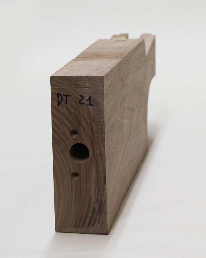 カスタムストックの製作材料(非オリジナル品)欧州産クルミ材です。機関部への接合までが完成されております。ベレッタDT11の他DT10やASEゴールドに適合します。上部・下部・後部の大きさは、通常のストック寸法と比べるとかなり大きいので、トラップ、スキート、ハイリブ等に対応する寸法であることと、厚みもコム付近および台尻付近まで6cm近くありますので、キャストオフの分量幅も多く、色々なサイズに加工できます。